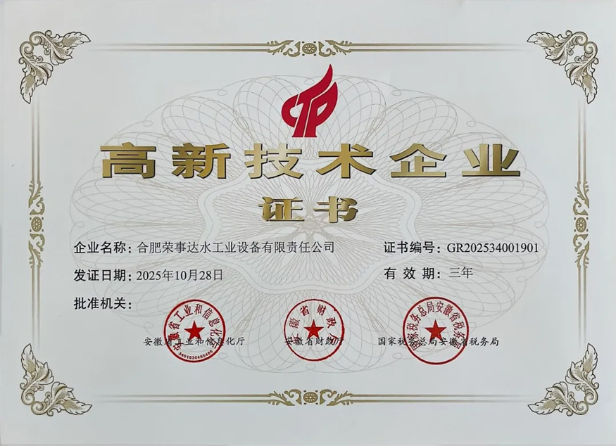 合肥榮事達水工業(yè)設備有限責任公司通過高新技術企業(yè)認定,榮獲由...